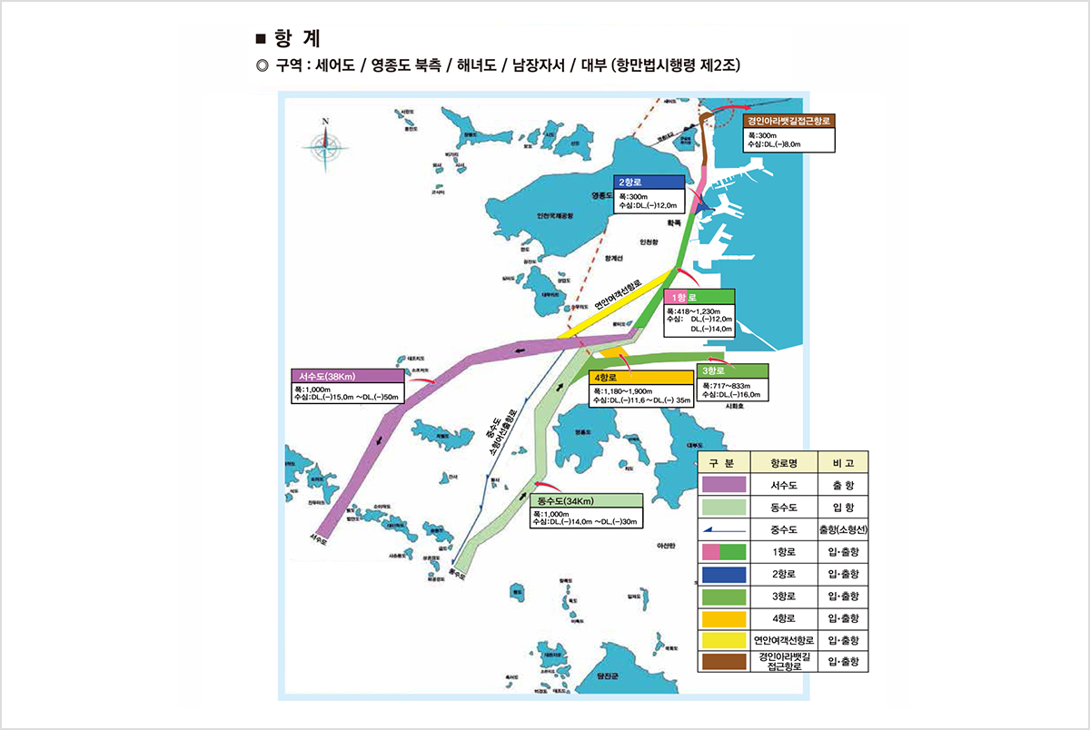 인천항은 산업항인 북항과 무역항인 내항, 남항, 신항이 있으며, 연안부두와 신남항의 국제여객부두 및 크루즈터미널이 있다. 인천항으로 선박이 입출항하기 위해서는 인천항의 항로를 따라 항해하여야 한다. 입항을 기준으로 팔미도를 좌측에 두고 인천항(남항, 북항 등)으로 들어오는 항로를 제1항로(이전의 동수도)라 한다. 내항으로서의 접근수로를 제2항로, 신항으로의 접근수로를 제3항로, 팔미도 남측에서 제1항로와 제3항로를 연결하는 수로를 제4항로라 한다. 출항을 기준으로 인천대교 밑에서 무의도 남측으로 나가는 항로를 연안여객선항로(이전의 서수도)라 한다. 이전에는 팔미도를 기준으로 동측항로인 동수도로 입항하여 서측항로인 서수도롤 출항하였으나 연안여객선과 상선의 입출항항로가 중첩되지 않도록 통항대를 분리하여 항로를 설정하여 통항의 안전을 도모하였다. 인천항에 출입하는 선박이 바닷길을 확인하기 위하여 바다 위에 등부표를 설치하였으며, 입항을 기준으로 항로의 오른쪽 선에는 홍색 등부표를 설치하였고 왼쪽 선에는 녹색 등부표를 설치해 두고 있다. 그리하여 입항하는 선박은 오른쪽에 홍색 등부표와 왼쪽에 녹색 등부표를 두고 그 사이를 따라 항해하면 되고 출항하는 선박은 오른쪽에 녹색 등부표와 왼쪽에 홍색 등부표를 사이에 두고 그 사이를 따라 항해하여야 한다.