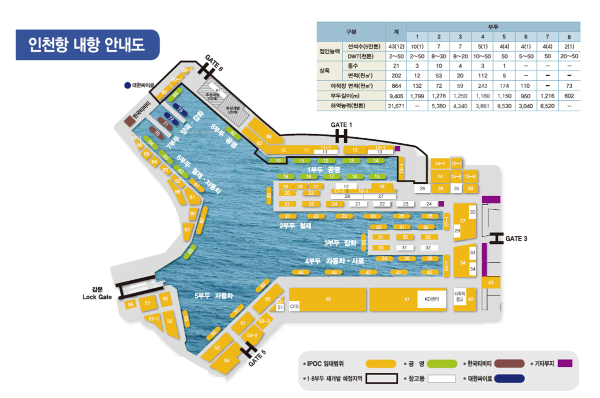 | 하역능력(천톤) | 31,671 | - | 5,380 | 4,340 | 3,861 | 8,530 | 3,040 | 6,520 | - | |