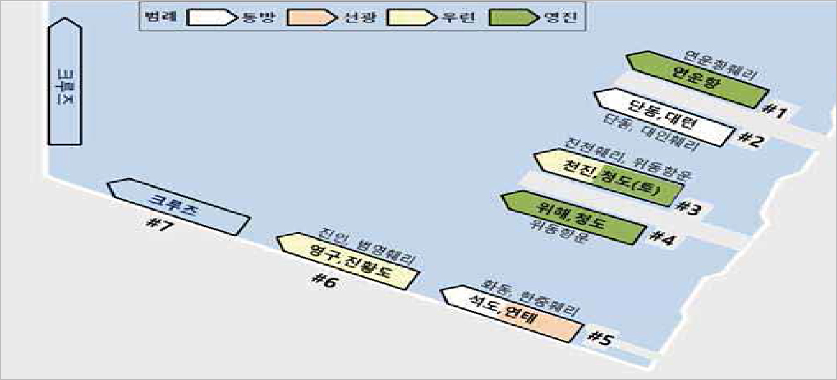 국제여객선석배정에 대하여는 1선석에는 연운항훼리호가, 2선석에는 단동항운훼리호와 대인호훼리호가, 제3선석에는 진천항운훼리호와 위동항운훼리호가 , 제4선석에는 위동항운훼리호가, 제5선석에는 화동해운훼리호와 한중훼리호가, 제6선석에는 진인해운훼리호와 범영훼리호가, 제7선석에는 프루즈선이 정박하도록 선석이 지정되어 있으며, 제6선석과 제7선석은 카리호와 크루즈선이 겸용하여 사용하고 있다.